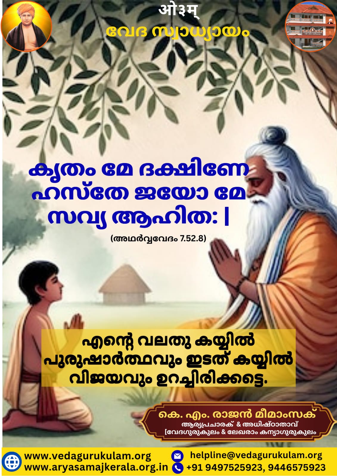 ഭാവാർത്ഥം:- എന്റെ വലതു കയ്യിൽ പുരുഷാർത്ഥവും ഇടത് കയ്യിൽ വിജയവും ഉറച്ചിരിക്കട്ടെ.