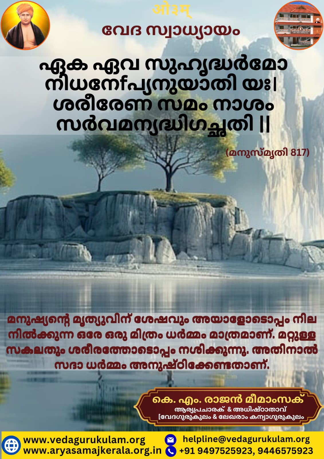മനുഷ്യന്റെ മൃത്യുവിന് ശേഷവും അയാളോടൊപ്പം നില നിൽക്കുന്ന ഒരേ ഒരു മിത്രം ധർമ്മം മാത്രമാണ്. മറ്റുള്ള സകലതും ശരീരത്തോടൊപ്പം നശിക്കുന്നു. അതിനാൽ സദാ ധർമ്മം അനുഷ്ഠിക്കേണ്ടതാണ്.