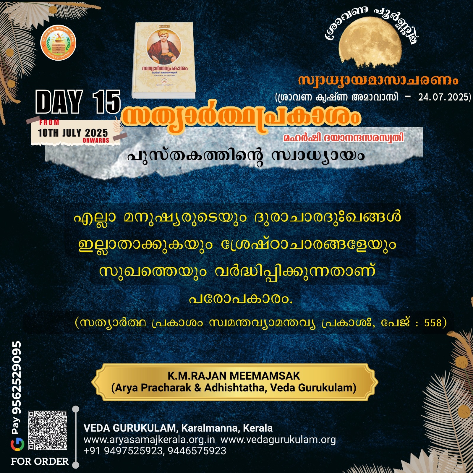 സത്യാർത്ഥപ്രകാശം സ്വാധ്യായം – പതിനഞ്ചാം ദിനം (ശ്രാവണ കൃഷ്ണ അമാവാസി – 24.07.2025) എല്ലാ മനുഷ്യരുടെയും ദുരാചാരദുഃഖങ്ങൾ ഇല്ലാതാക്കുകയും ശ്രേഷ്ഠാചാരങ്ങളRead More…