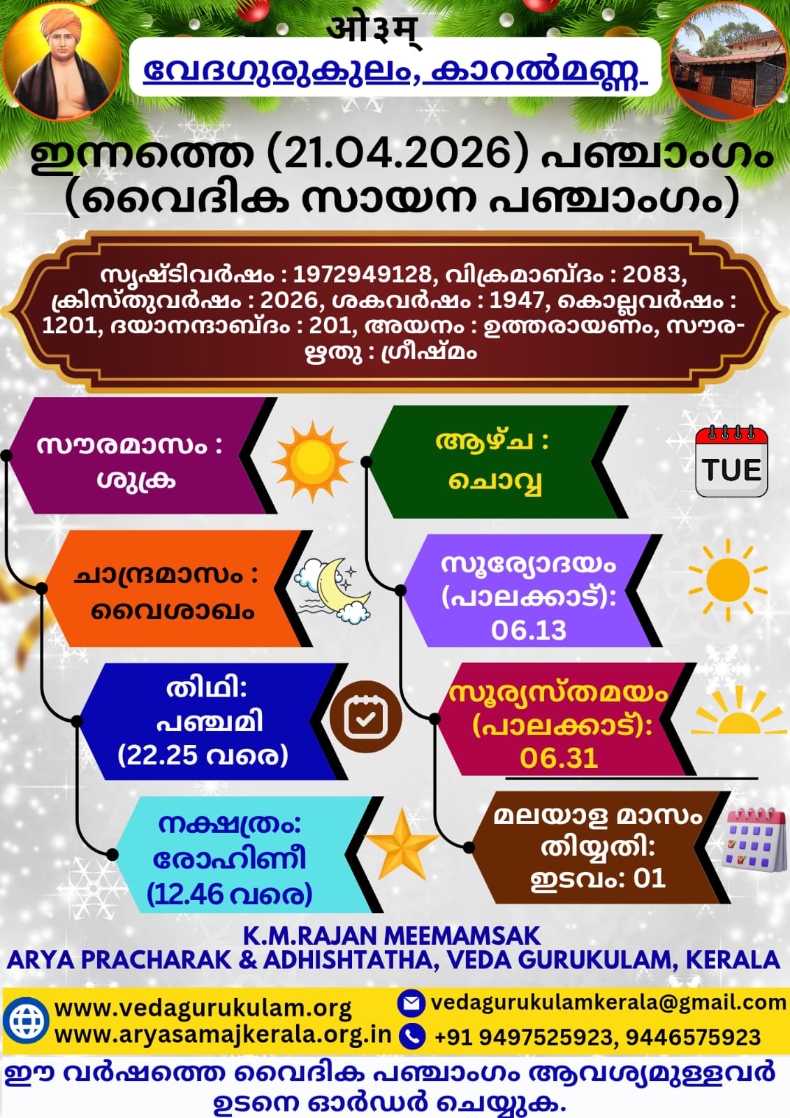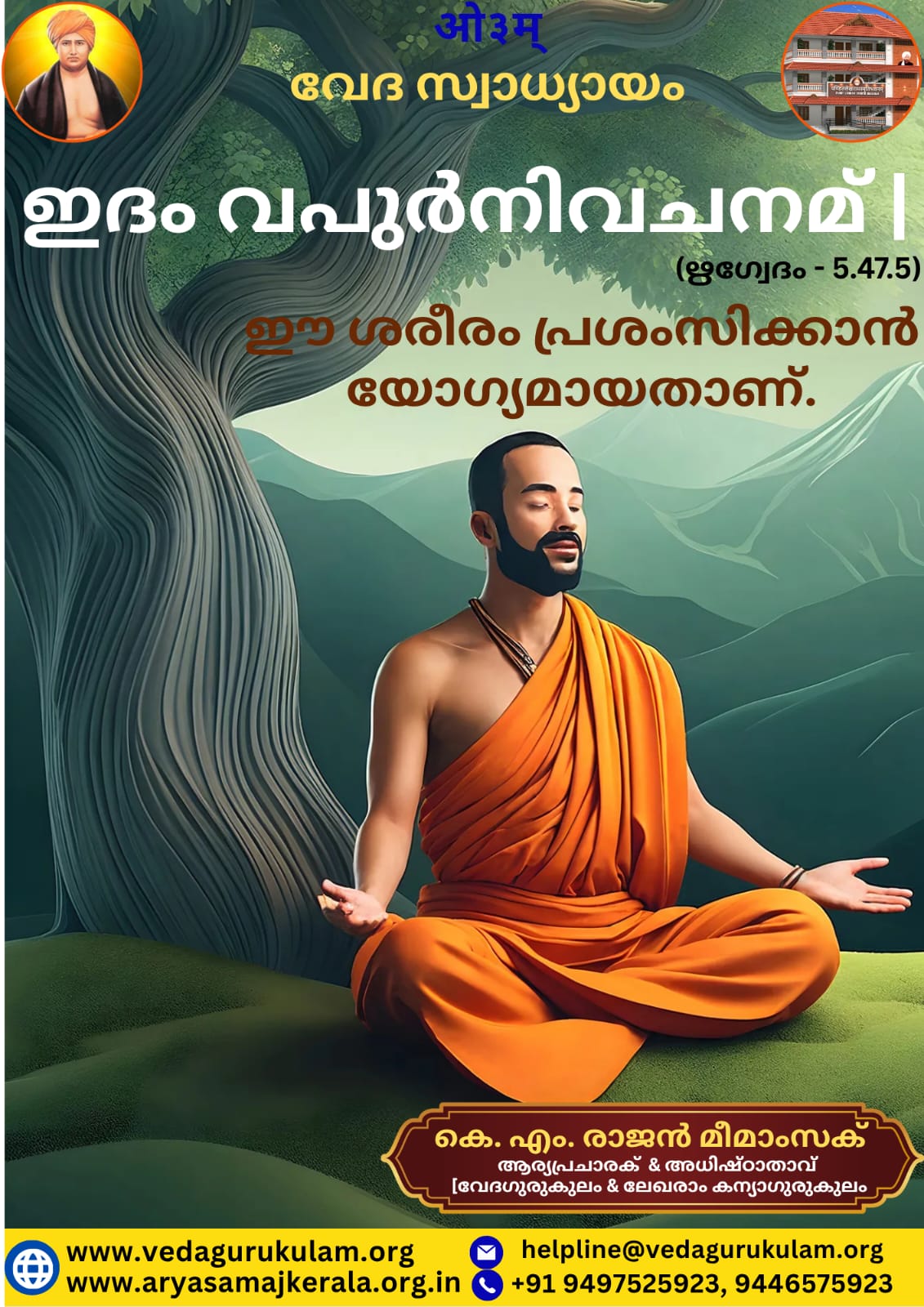 ✍️ കെ. എം. രാജൻ മീമാംസക് ഇദം വപുർനിവചനമ് l (ഋഗ്വേദം – 5.47.5) ഈ ശരീരം പ്രശംസിക്കാൻ യോഗ്യമായതാണ്. 🙏 കെ. എം. രാജൻ മീമാംസക്ആര്യപ്രചാരകൻ & അധിഷ്ഠാതാവ്വേദഗുRead More…