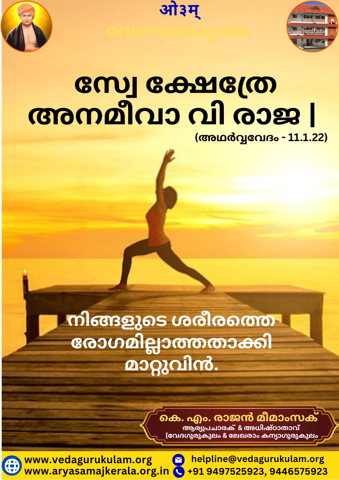 ✍️ കെ. എം. രാജൻ മീമാംസക് സ്വേ ക്ഷേത്രേ അനമീവാ വി രാജ l (അഥർവ്വവേദം – 11.1.22) നിങ്ങളുടെ ശരീരത്തെ രോഗമില്ലാത്തതാക്കി മാറ്റുവിൻ. 🙏 കെ. എം. രാജൻ മീമാംസക്ആര്Read More…