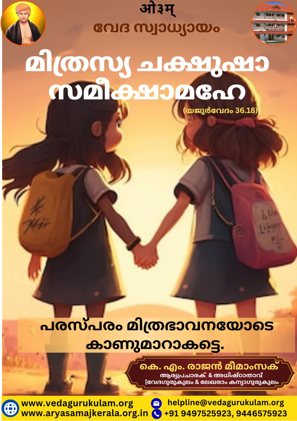 ✍️ കെ. എം. രാജൻ മീമാംസക് മിത്രസ്യ ചക്ഷുഷാ സമീക്ഷാമഹേ (യജുർവേദം 36.18) ഭാവാർത്ഥം:- നാം പരസ്പരം മിത്രഭാവനയോടെ കാണുമാറാകട്ടെ. 🙏 കെ. എം. രാജൻ മീമാംസക്ആര്Read More…