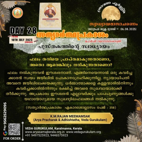 ഈ വരുന്ന തിങ്കളാഴ്ച (16.09.2024) കാലത്ത് 10 മണിമുതൽ 12 വരെ വേദഗുരുകുലത്തിൽ ഓണാഘോഷവും ഓണസദ്യയും ഒരുക്കുന്നുണ്ട്. ബ്രഹ്മചാരികളുടെ കലാ – കായിക പ്രദർശനവും ഗുരുകുലം അഭ്യുദയകാംക്ഷികളുടെ ഒരു യോഗവും ഇതോടൊപ്പം നടക്കുന്നുണ്ട്. വേദഗുരുകുലത്തിന്റെ നേതൃത്വത്തിൽ നടക്കുന്ന ധർമ്മ പ്രചാരപ്രവർത്തനങ്ങൾ വിലയിരുത്തുകയും വരാൻ പോകുന്ന ഗുരുകുലം വാർഷികോത്സവം, വിവിധ ക്ലാസ്സുകൾ, സേവാപ്രവർത്തനങ്ങൾ എന്നിവ ആസൂത്രണം ചെയ്യുക തുടങ്ങിയവ ഈ യോഗത്തിൽ ചർച്ച ചെയ്തു തീരുമാനിക്കുവാൻ ഉദ്ദേശിക്കുന്നു. വേദഗുരുകുലത്തിന്റെ സർവതോമുഖമായ വളർച്ച ആഗ്രഹിക്കുന്ന എല്ലാ ഗുരുകുലം അഭ്യുദയകാംക്ഷികളെയും ഈ ഓണാഘോഷ പരിപാടികളിലേക്ക് സ്നേഹപൂർവ്വം ക്ഷണിക്കുന്നു.