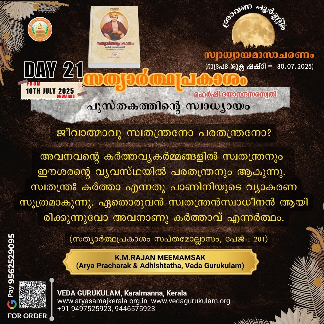 സത്യാർത്ഥപ്രകാശം സ്വാധ്യായം – ഇരുപത്തൊന്നാം ദിനം   (ഭാദ്രപദ ശുക്ല ഷഷ്ഠി – 30-07-2025)