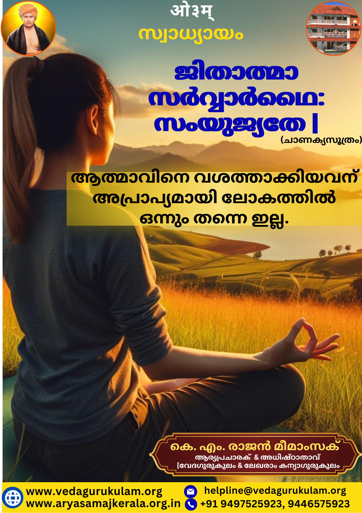 സ്വാധ്യായം Blog Veda Swadhyayam April 6, 2026April 5, 2026 Veda Gurukulam ✍️ കെ. എം. രാജൻ മീമാംസക് ജിതാത്മാ സർവ്വാർഥൈ: സംയുജ്യതേ l (ചാണക്യസൂത്രം) ആത്മാവിനെ വശത്താക്കിയവന് അപ്രാപ്യമായി ലോകത്തിൽ ഒന്നും തന്നെ ഇല്ല. 🙏 കെ. എം. രാജൻ മീമാംസക്ആര്യപ്രചാരകൻ & അധിഷ്ഠാതാവ്വേദഗുരുകുലം, കാറൽമണ്ണ & ലേഖരാം കന്യാഗുരുകുലം, വെള്ളിനേഴി Home