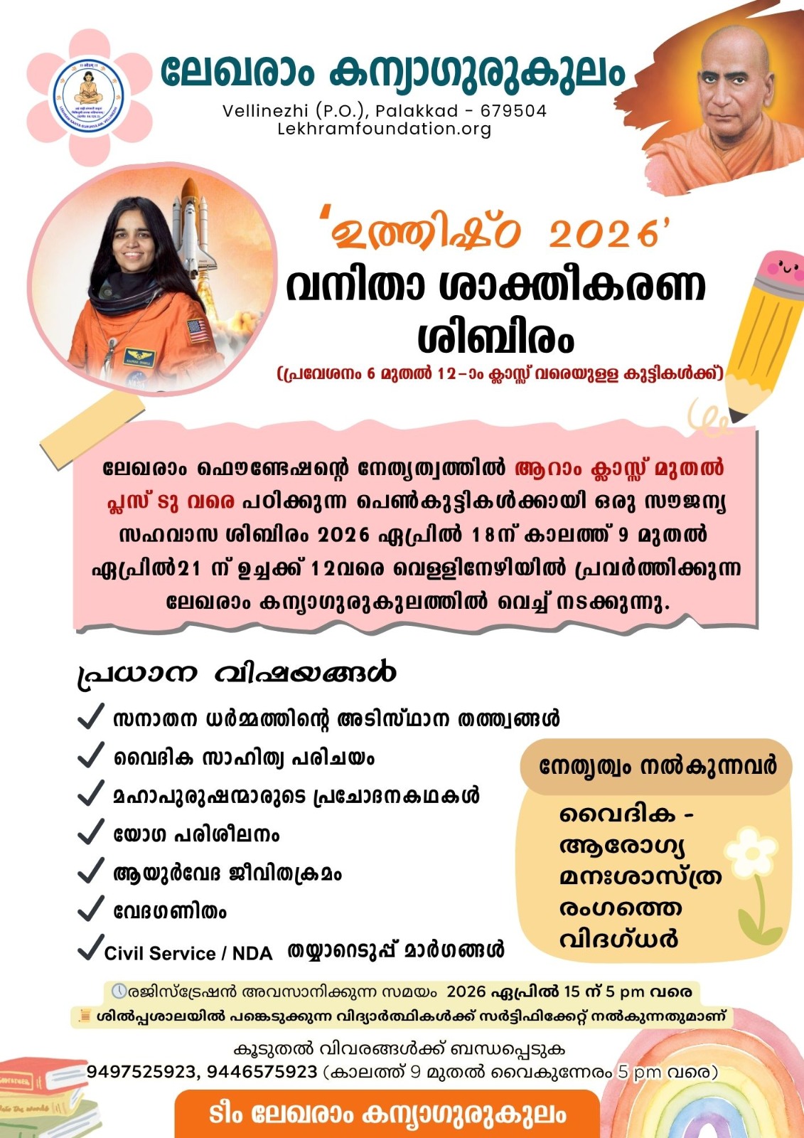 ലേഖരാം ഫൌണ്ടേഷന്റെ നേതൃത്വത്തിൽ ആറാം ക്ലാസ്സ് മുതൽ പ്ലസ് ടു വരെ പഠിക്കുന്ന പെൺകുട്ടികൾക്കായി ഒരു സൗജന്യ സഹവാസ ശിബിരം 2026 ഏപ്രിൽ 18ന് കാലത്ത് 9 മുതൽ ഏപ്രിൽ21ന് ഉച്ചക്ക് 12വരെ വെള്ളിനേഴിയിൽ പ്രവർത്തിക്കുന്ന ലേഖരാം കന്യാഗുരുകുലത്തിൽ വെച്ച് നടക്കുന്നു.