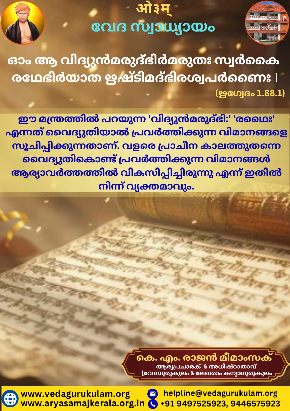 ഈ മന്ത്രത്തിൽ പറയുന്ന ‘വിദ്യുൻമരുദ്ഭി:’ ‘രഥൈഃ’ എന്നത് വൈദ്യുതിയാൽ പ്രവർത്തിക്കുന്ന വിമാനങ്ങളെ സൂചിപ്പിക്കുന്നതാണ്. വളരെ പ്രാചീന കാലത്തുതന്നെ വൈദ്യുതികൊണ്ട് പ്രവർത്തിക്കുന്ന വിമാനങ്ങൾ ആര്യാവർത്തത്തിൽ വികസിപ്പിച്ചിരുന്നു എന്ന് ഇതിൽ നിന്ന് വ്യക്തമാവും.