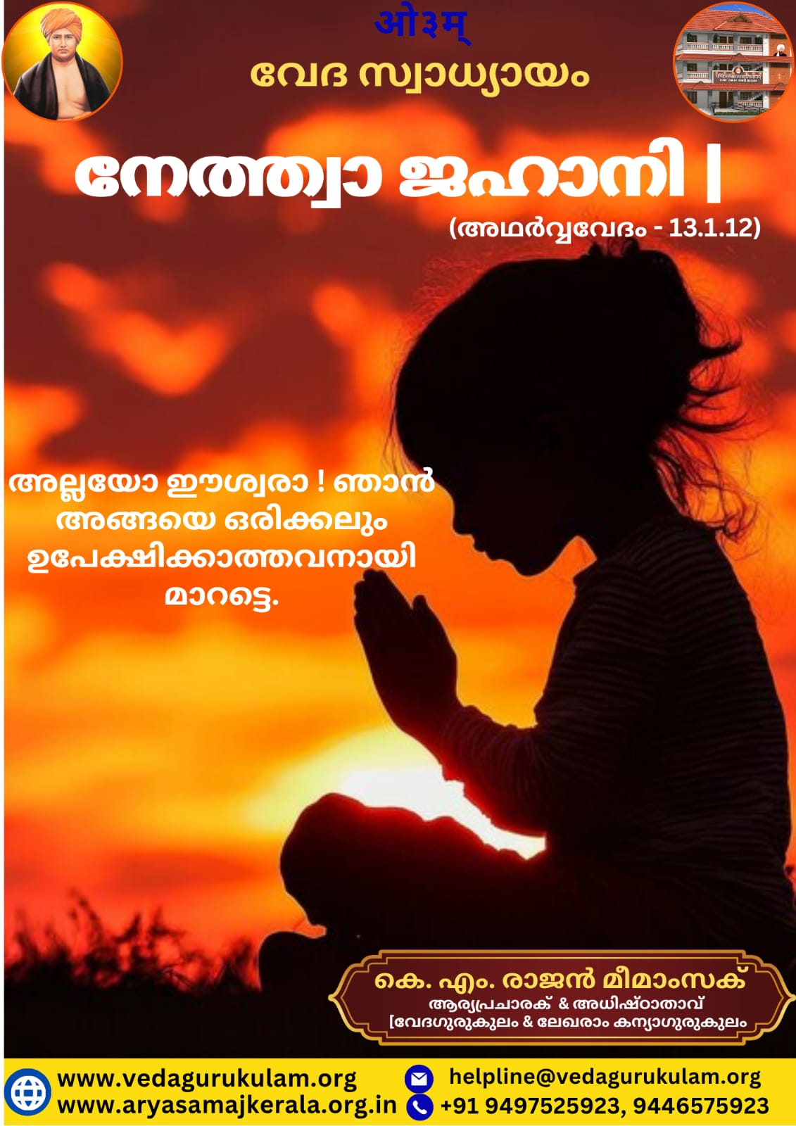 വേദ സ്വാധ്യായം Blog Veda Swadhyayam April 27, 2026April 26, 2026 Veda Gurukulam ✍️ കെ. എം. രാജൻ മീമാംസക് നേത്ത്വാ ജഹാനി l(അഥർവ്വവേദം – 13.1.12) അല്ലയോ ഈശ്വരാ ! ഞാൻ അങ്ങയെ ഒരിക്കലും ഉപേക്ഷിക്കാത്തവനായി മാറട്ടെ. 🙏 കെ. എം. രാജൻ മീമാംസക്ആര്യപ്രചാരകൻ & അധിഷ്ഠാതാവ്വേദഗുരുകുലം, കാറൽമണ്ണ & ലേഖരാം കന്യാഗുരുകുലം, വെള്ളിനേഴി Home